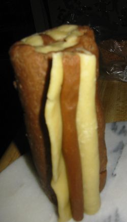 5:00pm I take the dough out of fridge. I make two slabs, one half the height of the other to form the Y part of the lambda. I stick them together, not quite perpendicular.